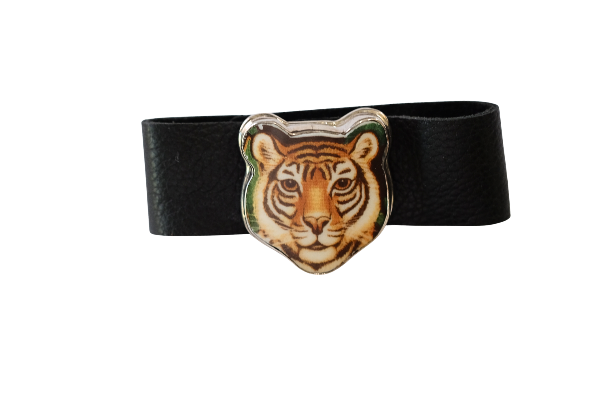 Tiger Face Leather Bracelet, set in sterling silver accented with black leather. Created from broken china.