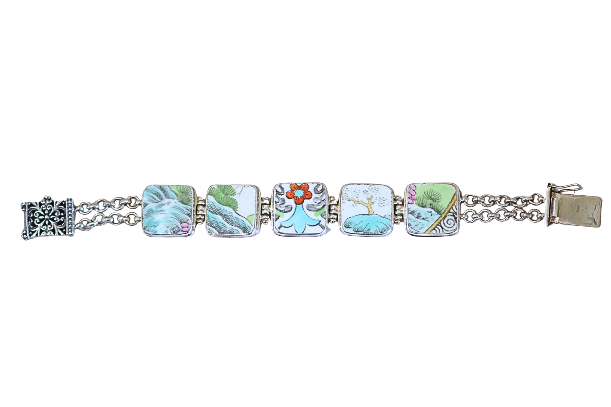 Gaudy Willow Bracelet, set in sterling silver. Created from broken china.