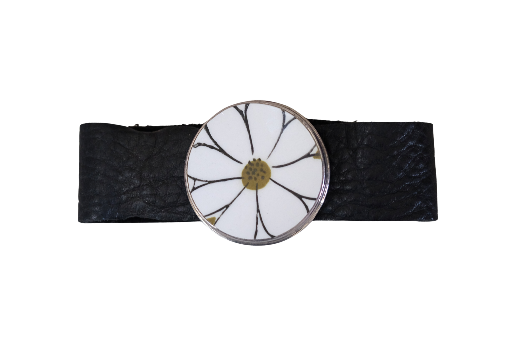 Round Retro Leather Bracelet, set in sterling silver, accented with black leather. Created from broken china.