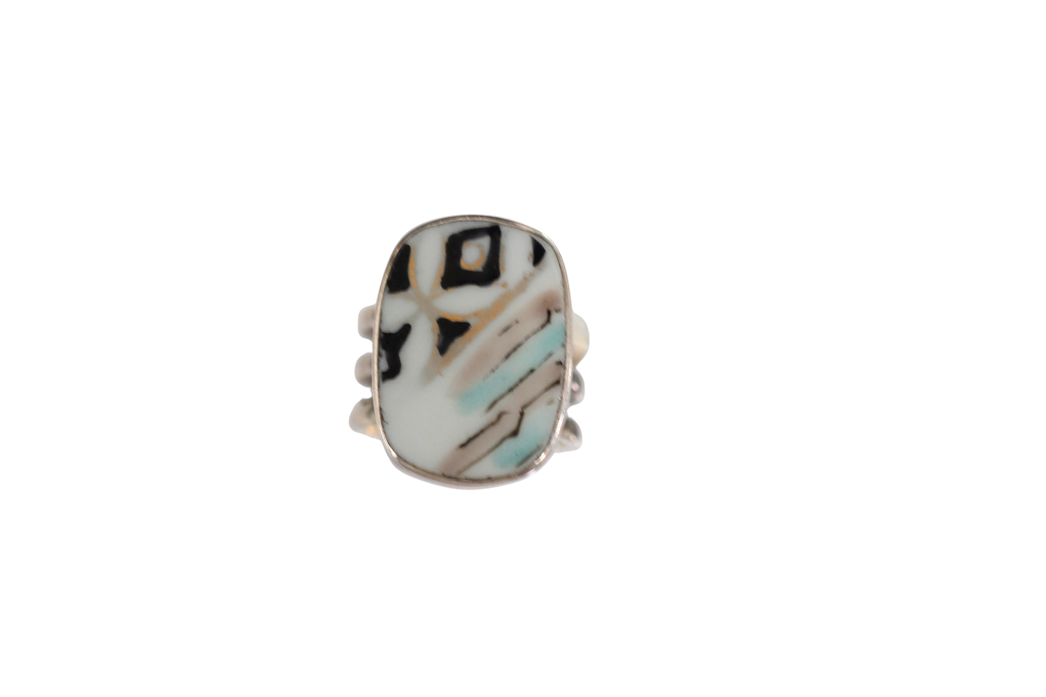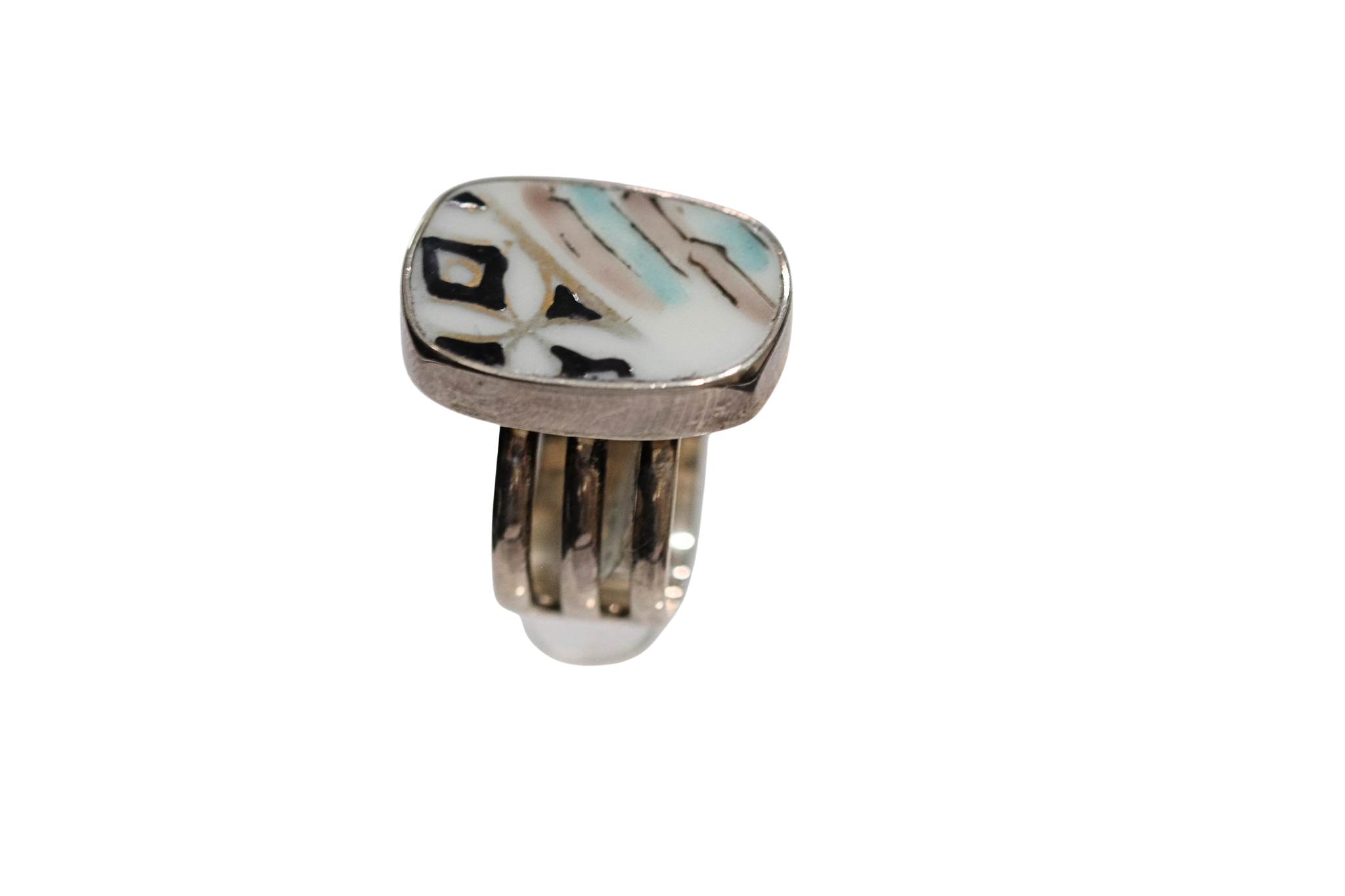 Size 6 Gaudy Willow Ring, set in sterling silver. Created from broken china.