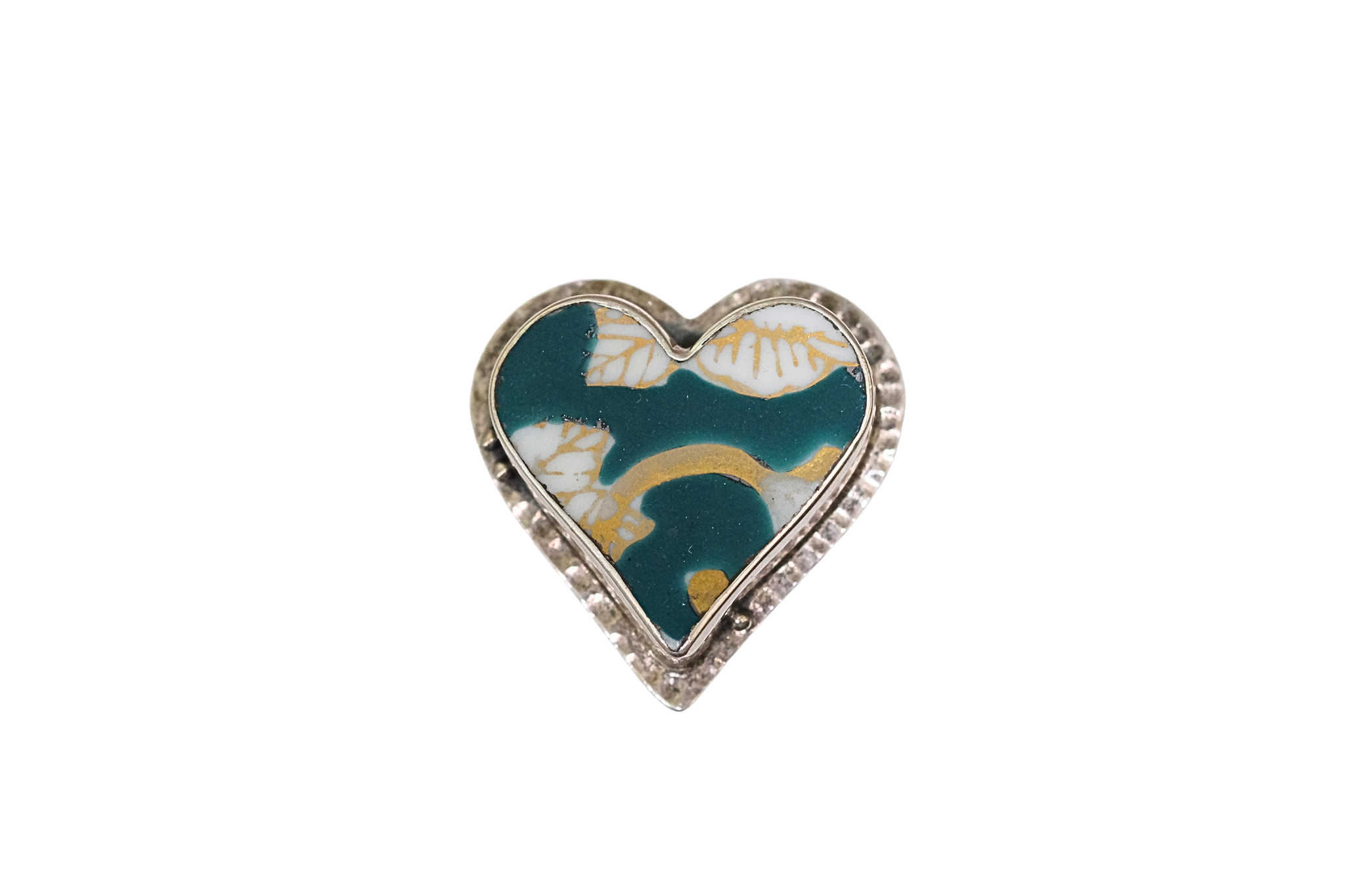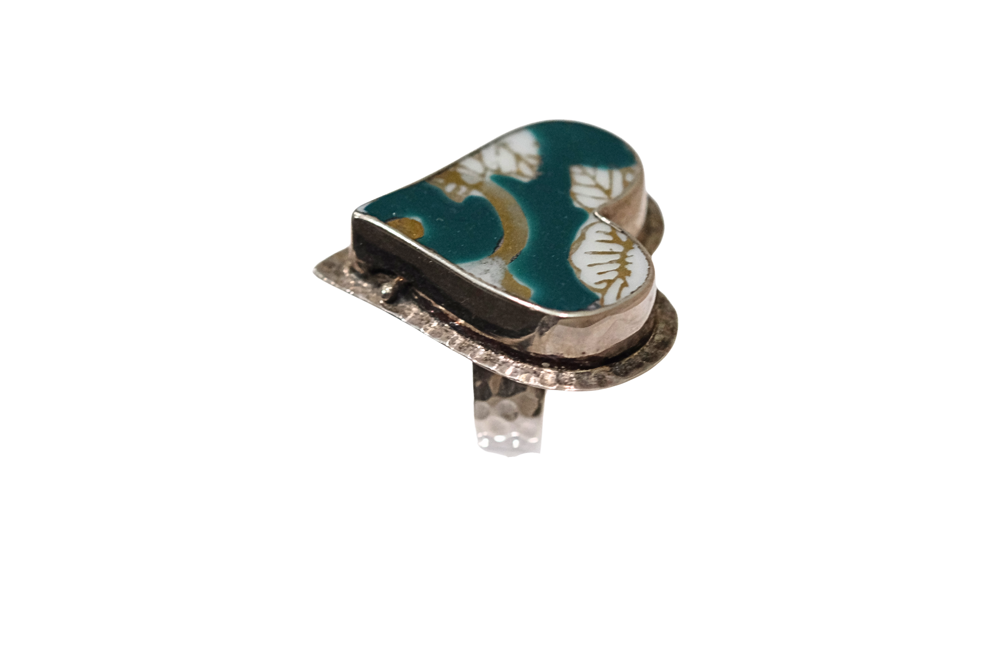 Size 8 Green Heart Ring, set in sterling silver. Created from broken china.