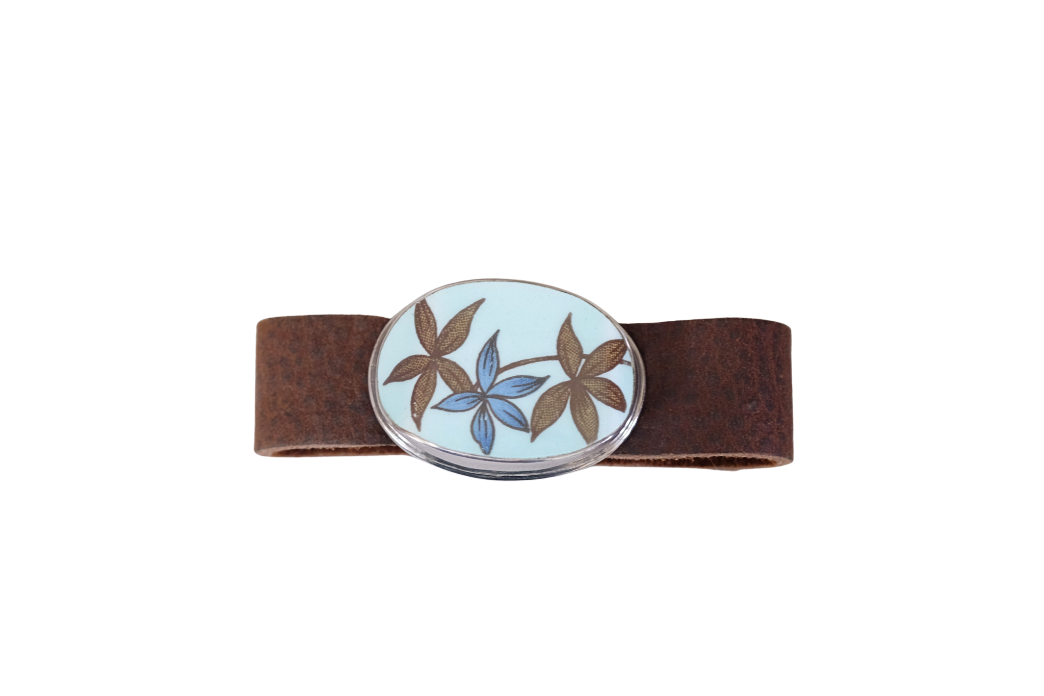 Adams Leafy Leather Bracelet, set in sterling silver, accented with brown leather. Created from broken china.